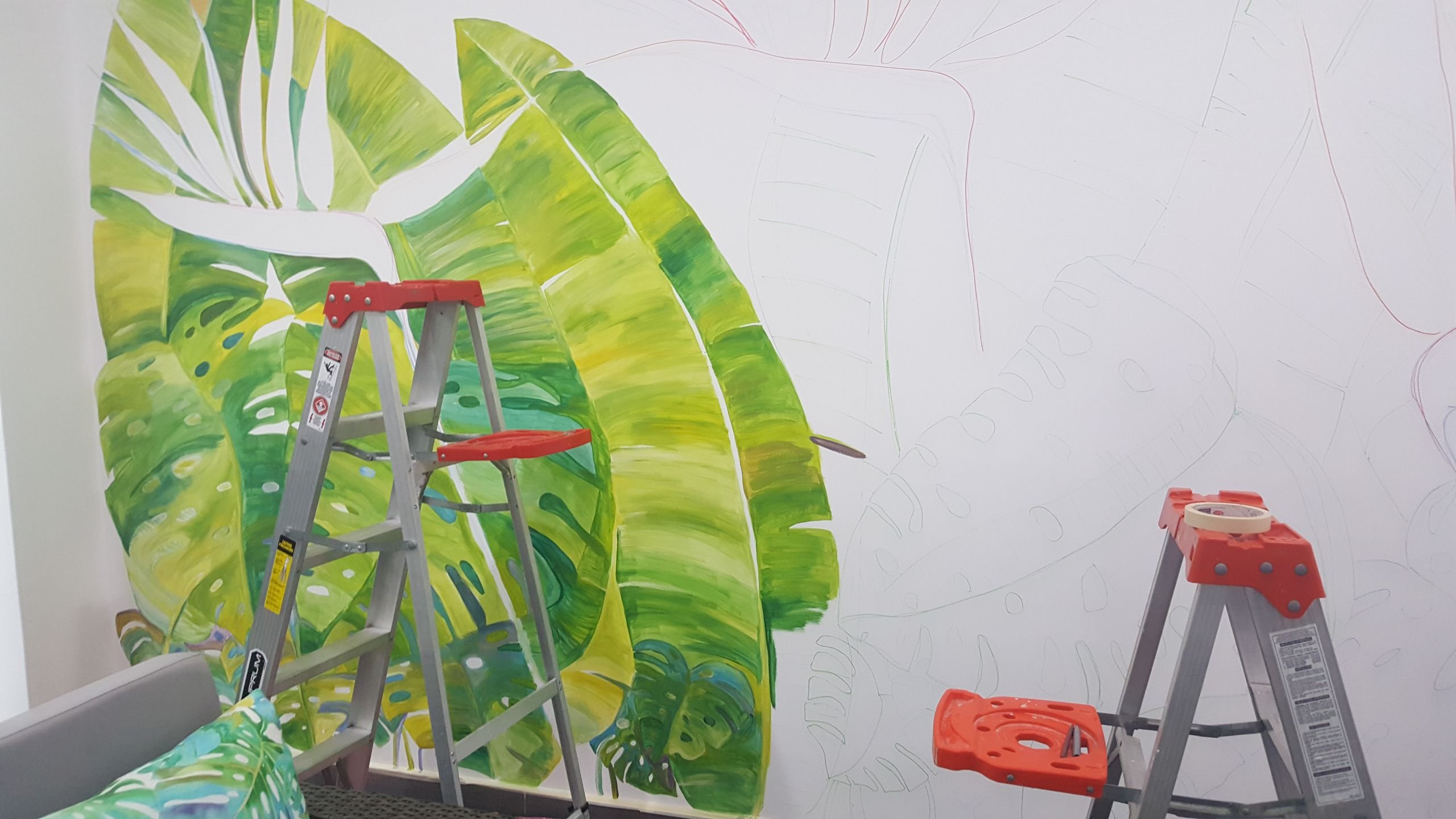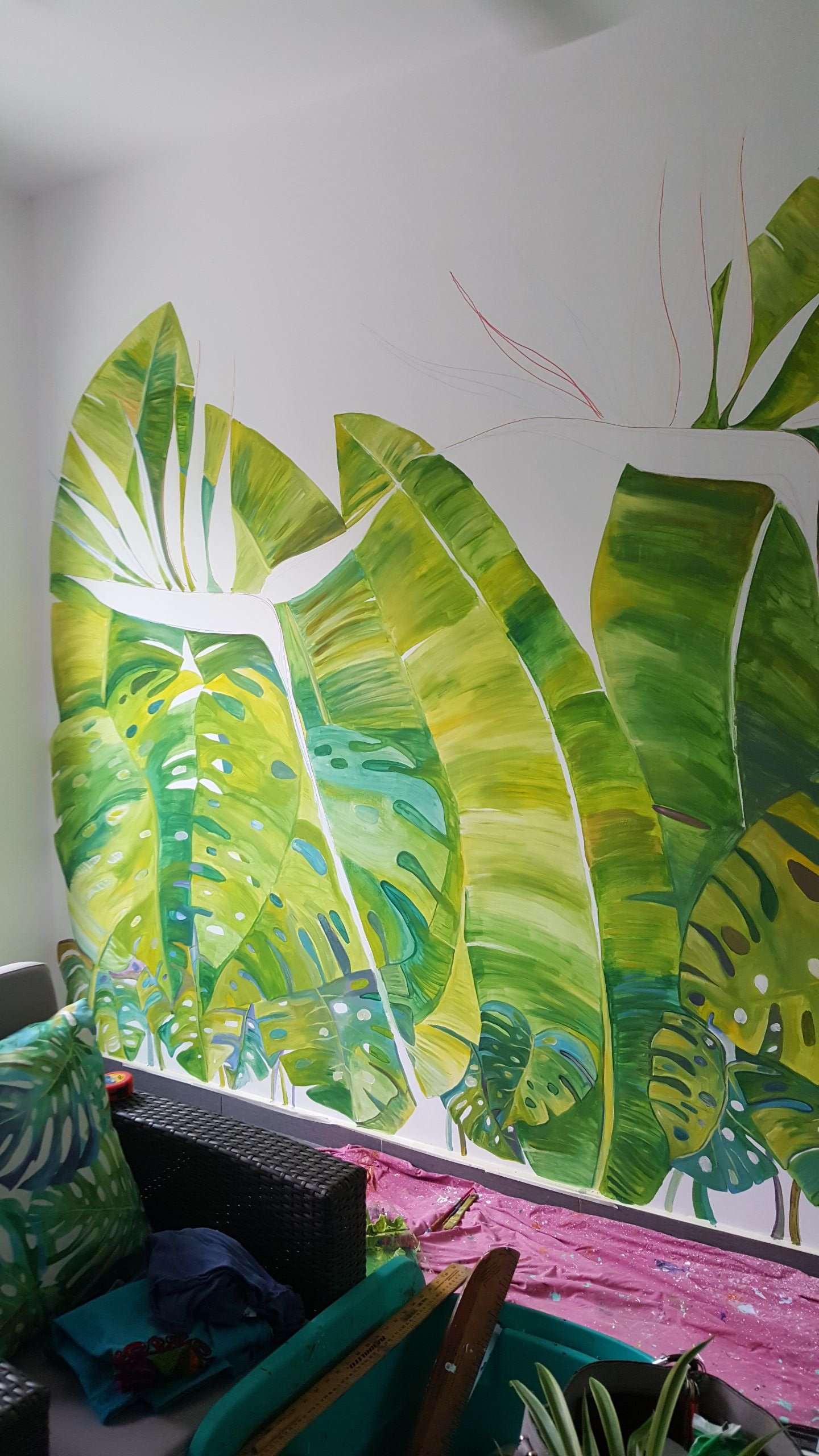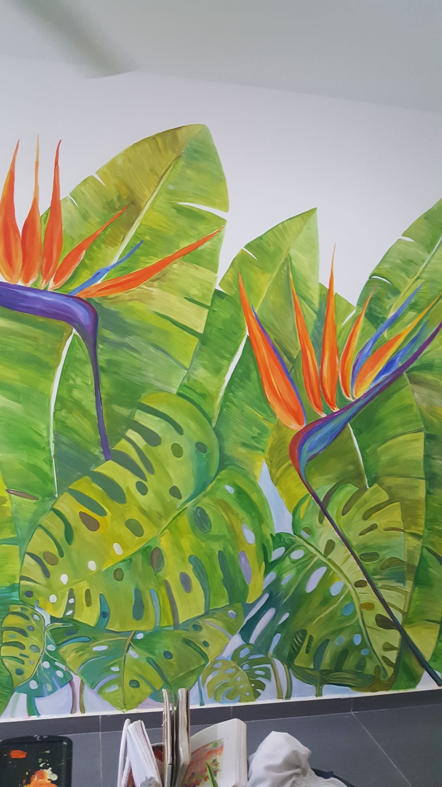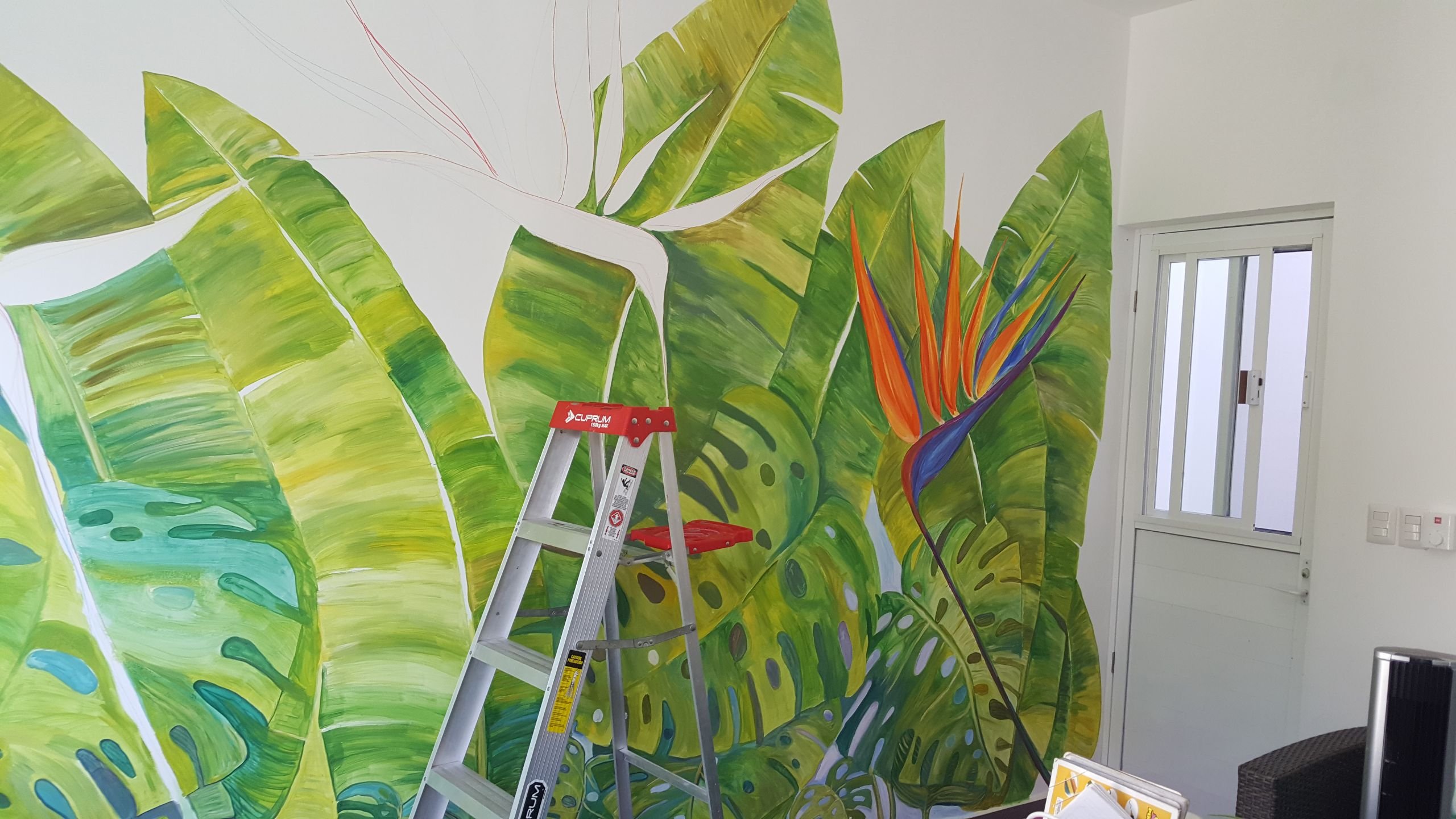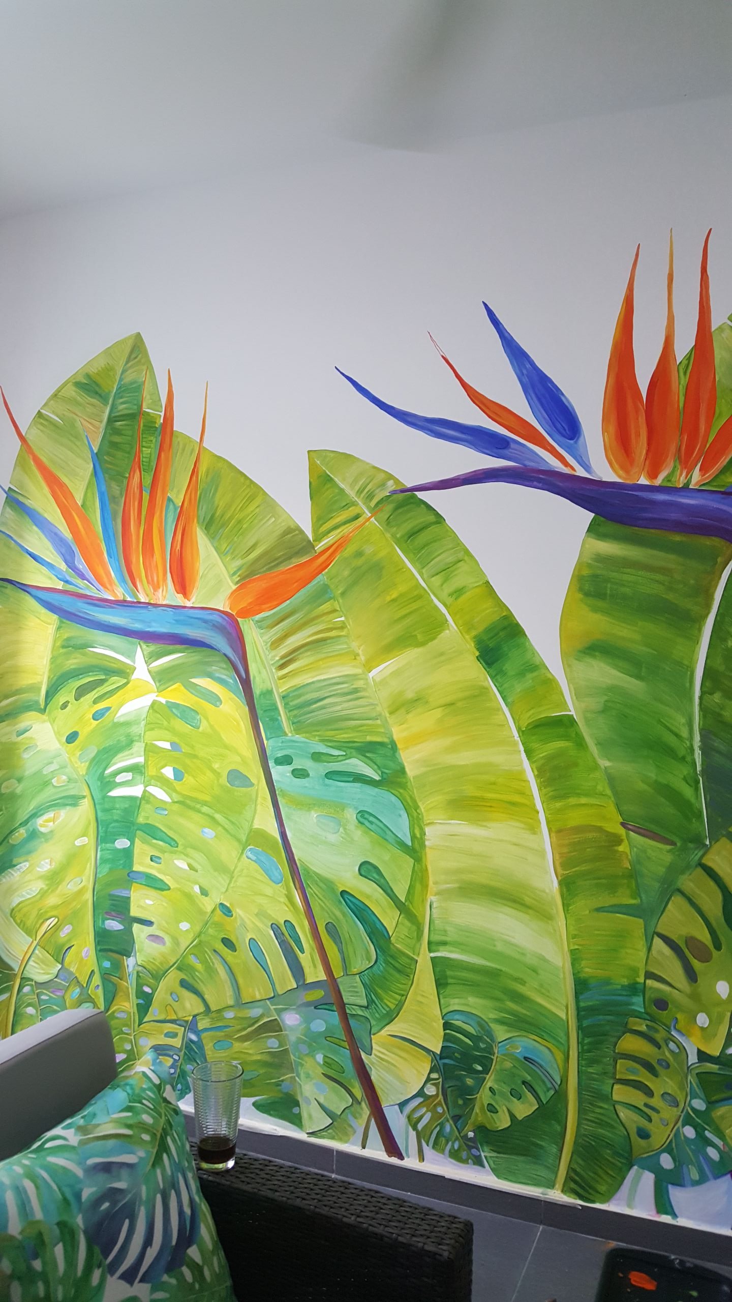 This beautiful mural inspired by tropical flowers and leaves, creates a relaxing and unique atmosphere for the delight of our private collector.